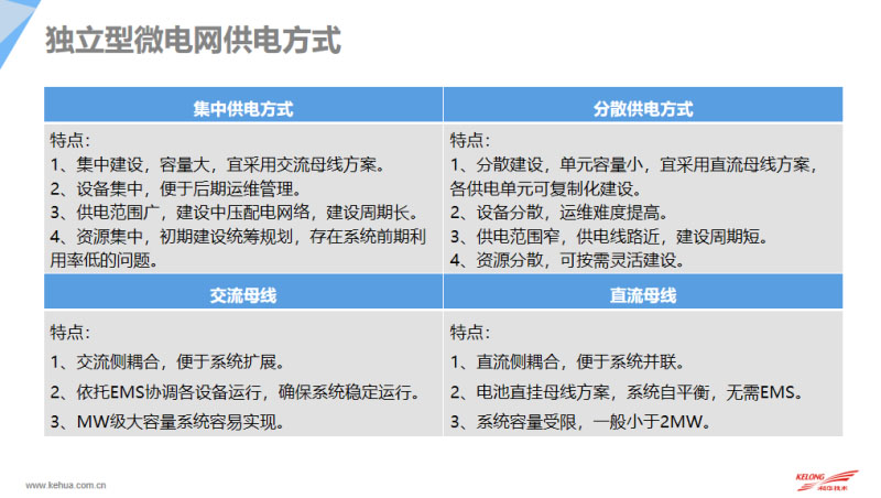 目前集中供電和分散供電都是有它的優(yōu)缺點(diǎn),對(duì)于集中供電的容量大,需要用交流母線(xiàn)方案,通過(guò)EMS協(xié)調(diào)各設(shè)備的運(yùn)行,同時(shí)集中供電的方案在前期負(fù)載不多的情況下存在可用率比較低,因?yàn)榧泄╇姡形⒕W(wǎng)儲(chǔ)能都是集中布局,對(duì)于運(yùn)維管理存在優(yōu)勢(shì)。分散供電的單元容量小,是可以做一個(gè)復(fù)制化的建設(shè),但是它的運(yùn)維難度相對(duì)來(lái)說(shuō)比較高。整個(gè)容量比較小的話(huà)我們直接采用直流母線(xiàn)的方案,其實(shí)可以便于做系統(tǒng)的自平衡,無(wú)需EMS系統(tǒng)實(shí)現(xiàn),這樣的話(huà)整個(gè)系統(tǒng)的穩(wěn)定性相對(duì)來(lái)說(shuō)會(huì)更高一點(diǎn)。
