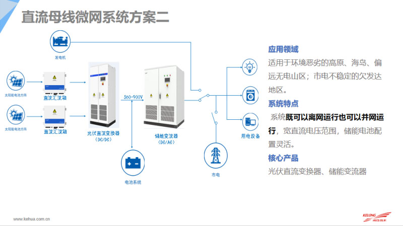 目前基于上述的微網(wǎng)方案,科華恒盛有一系列的微網(wǎng)產(chǎn)品:一是純離網(wǎng)系列,應(yīng)用到獨(dú)立的微網(wǎng)系統(tǒng)中,基于UPS改造的產(chǎn)品,主要包括光伏的MPPT控制器以模塊化設(shè)計(jì),包括基于UPS改變的離網(wǎng)逆變器,包括有把MPPT控制器和離網(wǎng)逆變器做成一體機(jī)進(jìn)行供貨,應(yīng)用到比較小的離網(wǎng)系統(tǒng)中。我們可以做一些離/并網(wǎng)產(chǎn)品儲(chǔ)能變流器等??迫A恒盛400伏接入的系統(tǒng),我們使用隔離型的變壓器,對(duì)于升壓的系統(tǒng),我們會(huì)考慮非隔離型變壓器,目前這款非隔離型最大功率做到630千瓦,尺寸也是更新設(shè)計(jì)到700深的尺寸,這樣可以滿(mǎn)足面對(duì)面放在集裝箱里,提高集裝箱的功率密度。隨著光伏系統(tǒng)1500伏的發(fā)展,包括1500伏系統(tǒng)目前在效率上的優(yōu)勢(shì),科華推出1500伏的儲(chǔ)能系列產(chǎn)品,單機(jī)功率最大可以做到1.5MW,儲(chǔ)能的直流變換器,把電池進(jìn)行DC/DC的直流轉(zhuǎn)換,我們和南方電網(wǎng)配合項(xiàng)目中,就應(yīng)用了此款產(chǎn)品。