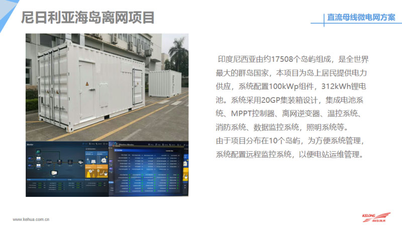 最后和大家分享一下目前我們科華恒盛在國(guó)內(nèi)外做的微網(wǎng)案例,包括目前在國(guó)內(nèi)外做了很多直流的離網(wǎng)供電,這是我們?cè)诜侵蘅溌∽龅碾x網(wǎng)供電,目前系統(tǒng)已經(jīng)斷斷續(xù)續(xù)出貨165套的離網(wǎng)系統(tǒng),系統(tǒng)容量大概是15千伏安到200千伏安不等。