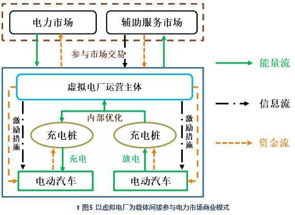 分散的電動(dòng)汽車(chē)參與電力市場(chǎng)交易,將面臨較高的市場(chǎng)門(mén)檻,從而影響用戶(hù)響應(yīng)程度。虛擬電廠是利用先進(jìn)的調(diào)控、計(jì)量、通信技術(shù)把分布式發(fā)電、分布式儲(chǔ)能設(shè)施、可控負(fù)荷等不同類(lèi)型分布式資源進(jìn)行整合優(yōu)化參與市場(chǎng)交易的載體。電動(dòng)汽車(chē)作為移動(dòng)儲(chǔ)設(shè)施具備的優(yōu)異特性,使其能夠很好地融入虛擬電廠,從而以間接方式參與電力市場(chǎng),打破了市場(chǎng)門(mén)檻的限制。該模式工作原理如圖5所示。