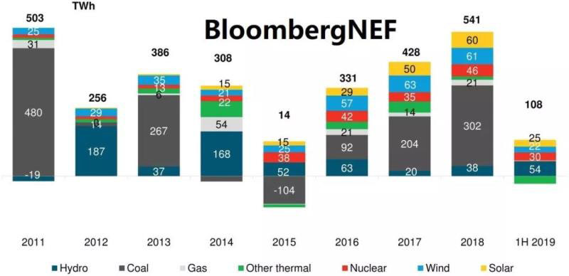 中國年度發(fā)電量的凈增量部分,按發(fā)電技術(shù)分類