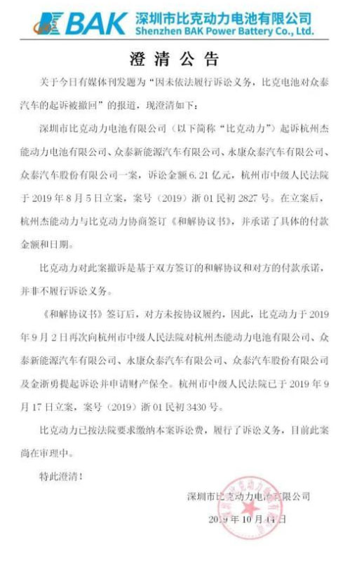 公告顯示,于今年8月5日立案的比克動(dòng)力電池對(duì)眾泰汽車的訴訟案被撤回是基于比克動(dòng)力電池與眾泰汽車雙方簽訂的和解協(xié)議和眾泰汽車的付款承諾,并非不履行訴訟義務(wù)。然而,眾泰汽車在簽訂和解協(xié)議后并未按協(xié)議履約,比克動(dòng)力已于9月2日再次向杭州市中級(jí)人民法院對(duì)眾泰汽車及其法人代表金浙勇提起訴訟并申請(qǐng)財(cái)產(chǎn)保全,杭州市中級(jí)人民法院已于2019年9月17日立案。