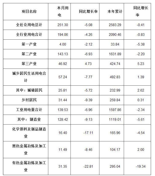 (一)全社會(huì)用電量情況。全省全社會(huì)用電量251.30億千瓦時(shí),同比減少5.08%;累計(jì)用電量2583.29億千瓦時(shí),同比減少0.41%。