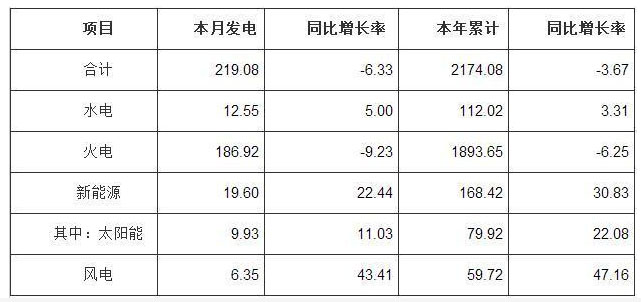 (一)發(fā)電量情況。9月份當(dāng)月,全省發(fā)電量219.08億千瓦時(shí),同比減少6.33%。其中水電12.55億千瓦時(shí),同比增長(zhǎng)5.00%;火電186.92億千瓦時(shí),同比減少9.23%;新能源19.60億千瓦時(shí),同比增長(zhǎng)22.44%。