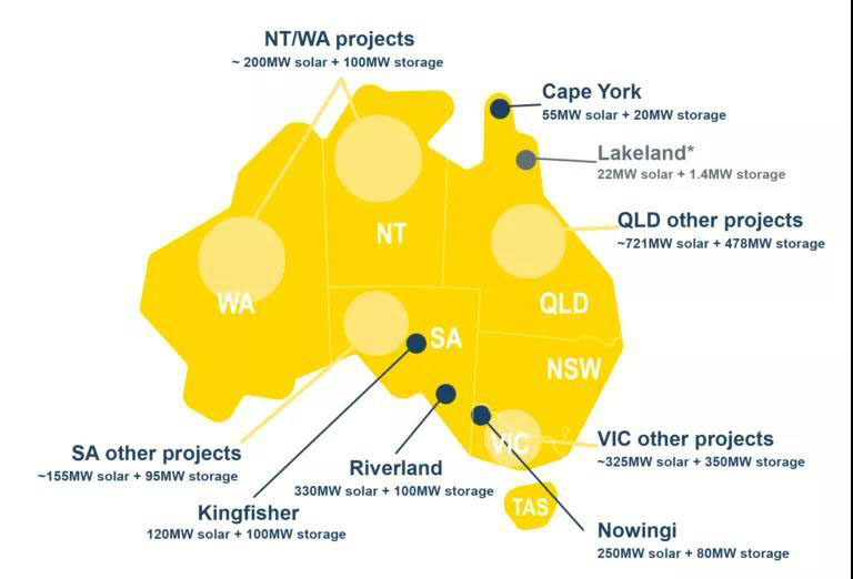 三家待售企業(yè)分別擁有三個(gè)太陽能加儲(chǔ)能配套項(xiàng)目,最突出的一個(gè)是投資1.5億美元的55MW約克角太陽能存儲(chǔ)項(xiàng)目,儲(chǔ)能項(xiàng)目的容量為20 MW / 80 MWh,是昆士蘭州政府7月份拍賣的10個(gè)可再生能源項(xiàng)目中的一個(gè)。里昂集團(tuán)將這個(gè)價(jià)值1.5億美元的設(shè)施描述為昆士蘭州第一個(gè)可調(diào)度的太陽能峰值發(fā)電廠。該公司表示,這意味著這個(gè)項(xiàng)目可以作為一臺(tái)“半調(diào)度”太陽能發(fā)電機(jī)運(yùn)行,其裝機(jī)容量高達(dá)55MW,但當(dāng)條件和價(jià)格適合時(shí),還可以通過電池儲(chǔ)能提供20MW的完全調(diào)度容量。