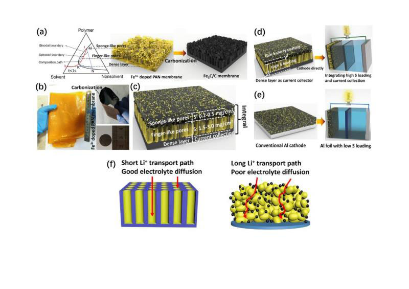 圖1. (a)相轉(zhuǎn)化法制備具有有序多孔結(jié)構(gòu)的一體化膜電極材料,(b, c)膜電極材料具有高載硫性能(> 3 mg cm-2), (d, e)載硫膜電極可以直接用作鋰硫電池正極,和傳統(tǒng)方法相比,節(jié)省了Al箔、導(dǎo)電碳粉末、粘結(jié)劑,從而有效提高了電池的能量密度,(f)電極膜孔的有序通道極大提高了離子在膜電極內(nèi)的傳遞速率。
