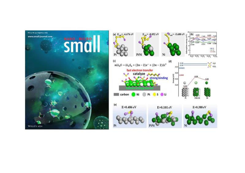 為提高膜電極內(nèi)電池內(nèi)動力學(xué)反應(yīng)速率,在多孔空心碳球的限域反應(yīng)器中合成Pt@Ni核殼材料,雙金屬不僅通過降低反應(yīng)能壘,加速電子轉(zhuǎn)移從而促進硫化鋰分解轉(zhuǎn)化,還增強了對多硫化物的親和吸附作用,實現(xiàn)了具有高容量和循環(huán)穩(wěn)定性的鋰硫電池。同時該研究還深入探究了雙金屬在鋰硫電池中的協(xié)同機理,并提供了相關(guān)的證明,為今后電催化在鋰硫電池中的應(yīng)用發(fā)展提供了借鑒,內(nèi)容以內(nèi)封面的形式發(fā)表(Small2019, 15, 1902431)。以上研究被邀請撰寫關(guān)于電極材料制備及儲能領(lǐng)域的綜述性論文(Small2019, 15, 1804737)。