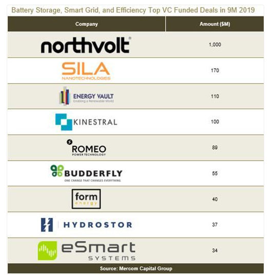 1-9月,電池存儲企業(yè)的VC資金增加了104%,共達(dá)成25筆交易,金額為16億美元,而2018年38筆交易融資7.83億美元。這一增加主要?dú)w因于Northvolt在2019年第二季度獲得10億美元融資。