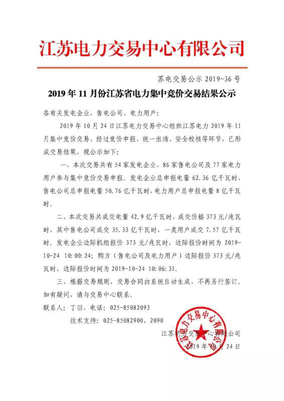 中國儲能網(wǎng)訊:江蘇電力交易中心于2019年10月24日發(fā)布了關(guān)于11月份江蘇省電力集中競價交易結(jié)果公示。