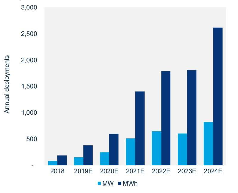 2018-2024年美國(guó)非住宅儲(chǔ)能部署的裝機(jī)容量和容量預(yù)測(cè)