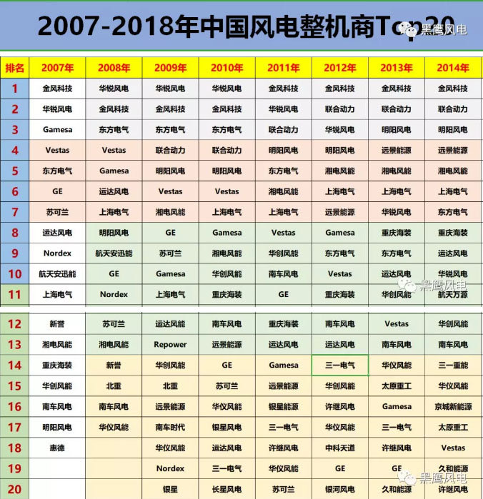 要跨越十五年的時(shí)間周期,理清整個(gè)中國(guó)風(fēng)電行業(yè)的競(jìng)爭(zhēng)變局,細(xì)枝末節(jié)已極難說(shuō)清。當(dāng)我們從歷年風(fēng)電整機(jī)商的具體排名變化,基本可以看到中國(guó)風(fēng)電市場(chǎng)競(jìng)爭(zhēng)格局、趨勢(shì)的大變化,如下表: