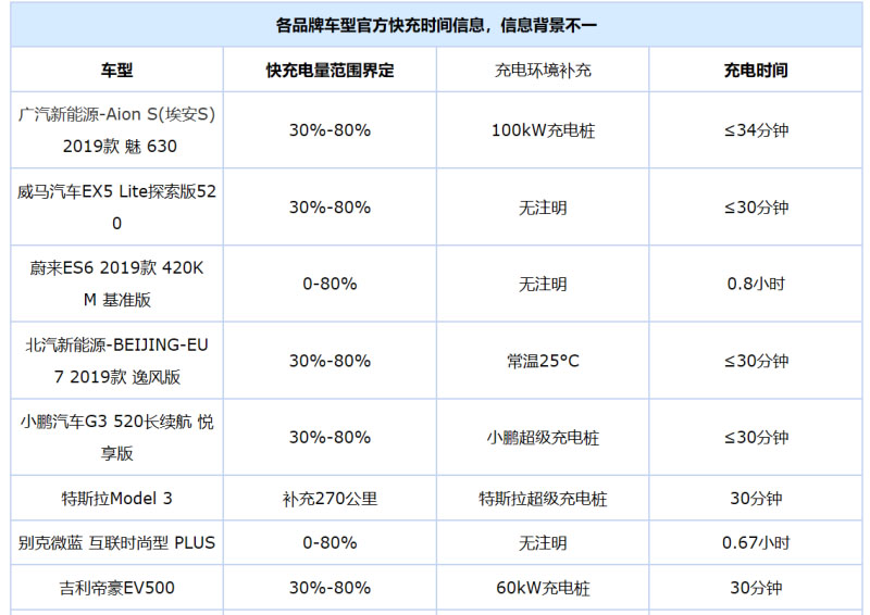 也由于各品牌之間的電池容量、控制系統(tǒng)策略等技術(shù)背景不同,官方發(fā)布充電時間信息范圍也有不同,例如有提供10%-80%或者20%-80%的說法,也有直接注明30分鐘可充入XX續(xù)航里程的描述,加上用戶充電習(xí)慣也有所不同,所以目前行業(yè)內(nèi)也沒有針對充電區(qū)間背景標(biāo)準(zhǔn)進(jìn)行規(guī)范。