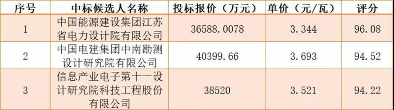 10月29日,華能泗洪光伏發(fā)電領(lǐng)跑獎勵激勵基地4號漁光互補(bǔ)項(xiàng)目公示EPC總承包中標(biāo)候選人,中國能源建設(shè)集團(tuán)江蘇省電力設(shè)計(jì)院有限公司以總價(jià)36588.0078萬元、單價(jià)3.344元/瓦成為第一中標(biāo)候選人。