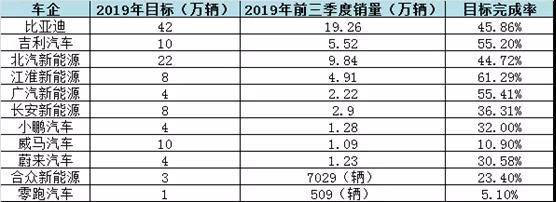 具體來看,其中比亞迪汽車,以前9個月累計銷售19.26萬輛新能源汽車位居第一,同比增長34.31%,但是也只完成了42萬銷量目標的45.86%。