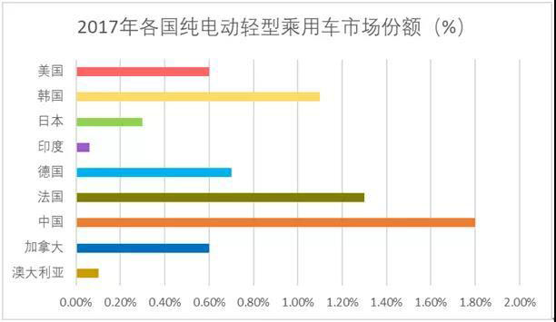 從全球電動車市場來看,中國電動車,特別是純電動車的銷量和保有量均遙遙領(lǐng)先。國際能源署發(fā)布的全球電動輕型乘用車保有量數(shù)據(jù)(圖1)顯示,中國純電動車保有量在2014年后加速顯著,2017年同比增長96.9%,占全球保有量的49.3%。中國電動輕型乘用車銷售市場份額2017年達(dá)1.8%,領(lǐng)先于美國、德國、日本等主要發(fā)達(dá)國家(圖2)。