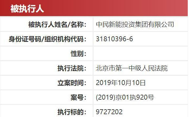 新京報記者自全國法院執(zhí)行信息平臺獲悉,中民新能投資集團有限公司已經(jīng)在近日被北京市第一中級人民法院列為被執(zhí)行人,案號(2019)京01執(zhí)920號,立案時間2019年10月10日,執(zhí)行標的“9727202”。