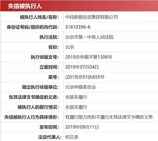 新京報記者獲悉,今年7月,中民新能已被北京市第一中級人民法院列為失信被執(zhí)行人,執(zhí)行依據(jù)文號2019京仲裁字第1306號,立案時間2019年7月4日,失信被執(zhí)行人行為具體情形為“有履行能力而拒不履行生效法律文書確定義務(wù)”,該則失信信息發(fā)布于9月11日。