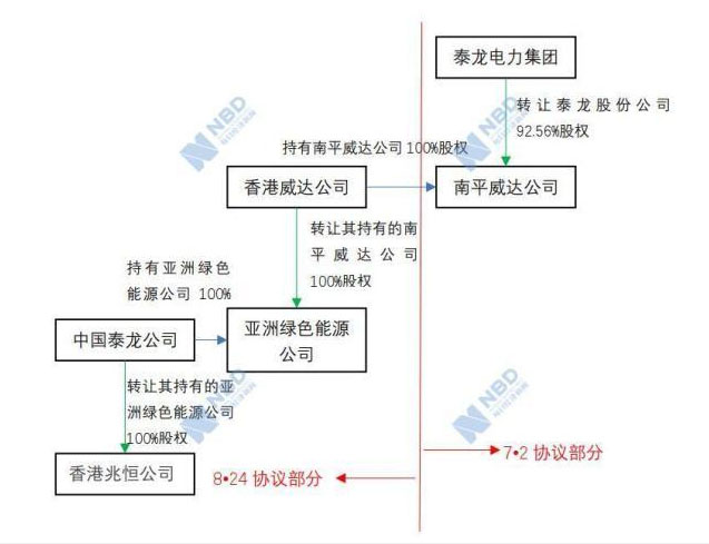 據(jù)前述《判決書》和葉躍松向《每日經(jīng)濟新聞》記者提供的8·24協(xié)議掃描件,8·24協(xié)議的4.3(3)條款有如此約定:“于簽訂本協(xié)議的同時,泰龍電力集團、廈門漢銀公司須與買方(或其指明的公司或人士)各簽訂一份股權轉讓協(xié)議,泰龍電力集團、廈門漢銀公司同意轉讓其持有的泰龍股份公司92.56%、1.18%股權給買方(或其指明的公司或人士);同時,威達(香港)能源開發(fā)有限公司(以下簡稱香港威達公司)須與買方(或其指明的公司或人士)簽訂一份股權轉讓協(xié)議,香港威達公司同意轉讓其持有的南平威達公司100%股權給買方(或其指明的公司或人士)。”