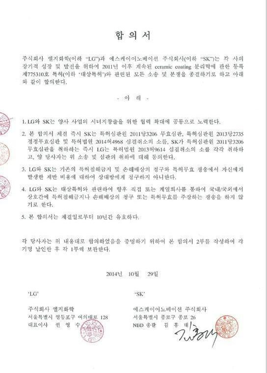 LG 化學和 SK Innovation 于2014年10月29日就以下條款達成了協(xié)議,目的是為了終止所有與陶瓷涂層分離器的775310號專利相關的訴訟和法律糾紛。這些訴訟和法律糾紛始于2011年,為了雙方的長遠發(fā)展考慮,兩家公司于2014年終止了這些訴訟和法律糾紛。以下是協(xié)議的詳細內(nèi)容: