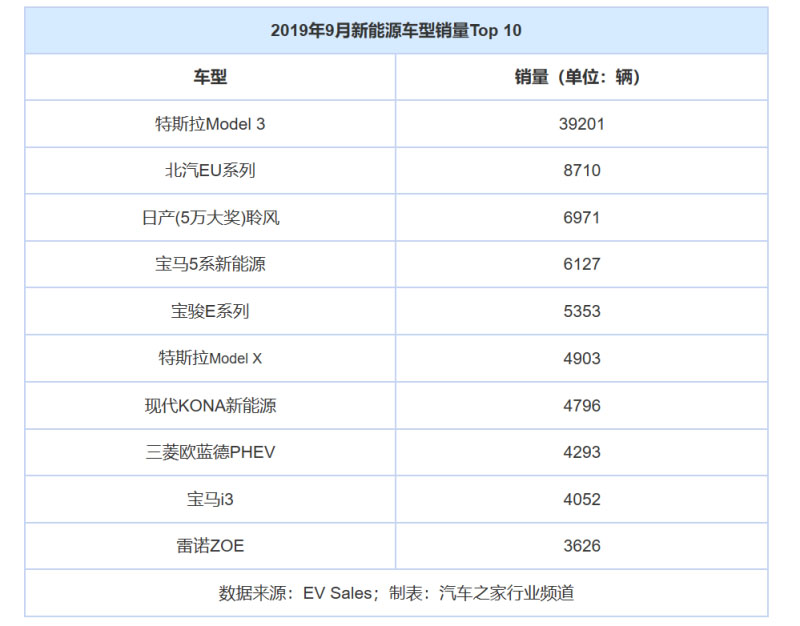 在人們以往認(rèn)知中,中國(guó)新能源車型通常會(huì)占全球銷量排名前十強(qiáng)的一半以上,而如今凈僅剩兩款產(chǎn)品的境況令人唏噓。且嚴(yán)格來(lái)講,上榜的中國(guó)新能源產(chǎn)品并非一款車,其中寶駿E系列包含寶駿E100及寶駿E200,北汽EU系列則包含EU260、EU400、EU5等車型。而反觀特斯拉和寶馬,則各有兩款車型上榜,尤其特斯拉Model 3以超越排名第二的北汽EU系列30491輛的成績(jī)獲得2019年全球新能源汽車銷量冠軍。