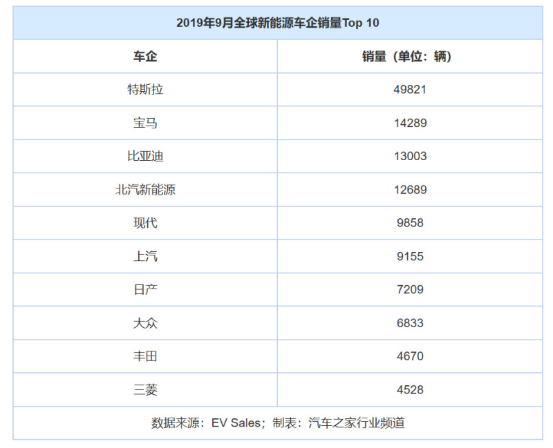 車企方面,2019年9月,排名前三強(qiáng)的車企分別是特斯拉、寶馬及比亞迪,此前常見(jiàn)的特斯拉/比亞迪/北汽新能源的組合格局被打破,寶馬9月以1.4萬(wàn)輛的成績(jī)躍居第二,比亞迪則落至第三,銷量為1.3萬(wàn)輛。中國(guó)新能源車企方面,進(jìn)入9月前十強(qiáng)的除了比亞迪之外,還有北汽新能源和上汽集團(tuán),而此前經(jīng)常上榜的江淮汽車、奇瑞汽車、吉利汽車等多個(gè)中國(guó)選手則被“擠”出排行榜。不過(guò)在前9月累計(jì)銷量的前十強(qiáng)榜單上,吉利以6.2萬(wàn)輛的成績(jī)排名第七。