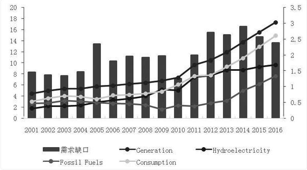 根據(jù)EIA數(shù)據(jù),2016年緬甸共發(fā)電173億度,同比增加17%,其中水力發(fā)電96億度,化石能源發(fā)電76億度。與老撾的發(fā)電結構相似,水力與化石能源是緬甸的主要發(fā)電方式。從緬甸電力供需結構圖中可以看出,2000年以來緬甸發(fā)電規(guī)模持續(xù)擴大,2010年后增速上移,主要是受到化石能源發(fā)電容量增加影響。