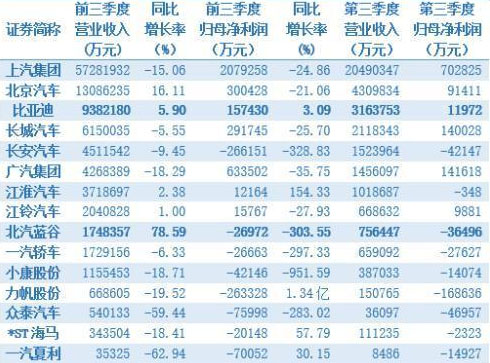 若單看第三季度,車企經(jīng)營(yíng)狀況更差,凈虧損企業(yè)數(shù)高達(dá)9家,占所統(tǒng)計(jì)車企的60%,還能實(shí)現(xiàn)盈利的幾乎均為行業(yè)龍頭如上汽集團(tuán)、北京汽車(港股01958)、比亞迪、長(zhǎng)城汽車(港股02333)、廣汽集團(tuán)(港股02238)。