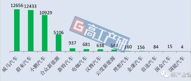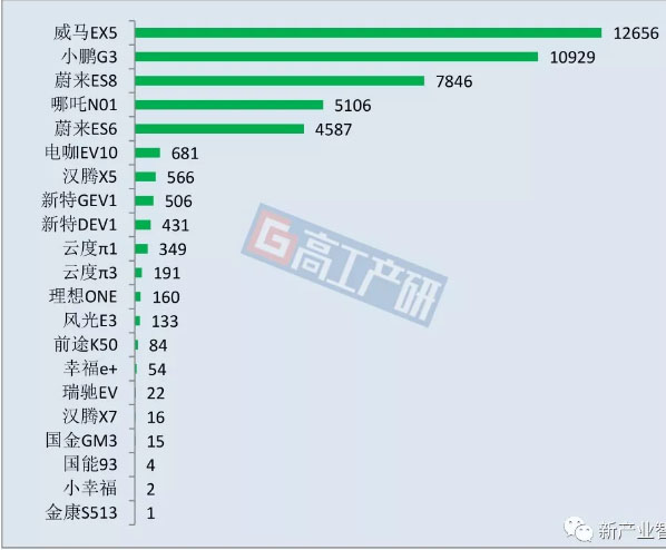2019年前三季度造車新勢力各車型銷量排名(輛)