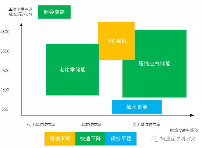 可見(jiàn),從國(guó)民經(jīng)濟(jì)評(píng)價(jià)角度,電網(wǎng)側(cè)儲(chǔ)能具有良好的外部性,針對(duì)具體的電網(wǎng)側(cè)儲(chǔ)能項(xiàng)目,可設(shè)定假定參數(shù),開(kāi)展面向電力系統(tǒng)效益的財(cái)務(wù)分析,為電網(wǎng)側(cè)儲(chǔ)能投資、建設(shè)、可持續(xù)發(fā)展路徑以及市場(chǎng)化機(jī)制和政策的建立提供參考?;陔娏ο到y(tǒng)效益的電網(wǎng)側(cè)儲(chǔ)能成本主要包括建設(shè)成本、安裝成本、運(yùn)行維護(hù)成本、更新改造成本。電網(wǎng)側(cè)儲(chǔ)能在電力系統(tǒng)中的收益主要包括、提升電網(wǎng)利用效率、提高供電可靠性、節(jié)能收益、減排收益、延緩裝機(jī)總量收益、應(yīng)急供電收益、參與電力市場(chǎng)輔助服務(wù)收益等。根據(jù)基于電力系統(tǒng)效益的電網(wǎng)側(cè)儲(chǔ)能成本和收益分析,利用項(xiàng)目財(cái)務(wù)分析方法和模型,對(duì)相同邊界條件下各類(lèi)電網(wǎng)側(cè)儲(chǔ)能經(jīng)濟(jì)性進(jìn)行評(píng)價(jià),定性得到其各類(lèi)項(xiàng)目經(jīng)濟(jì)性結(jié)果和內(nèi)部收益率范圍,如下圖所示。