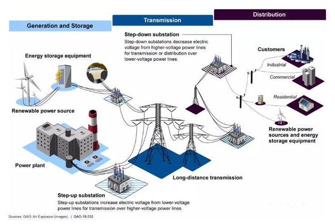 圖2 美國電網(wǎng)電能的生產(chǎn)和存儲、傳輸及配送