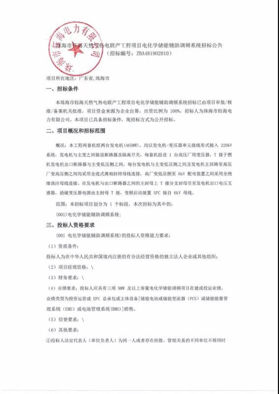 中國儲能網(wǎng)訊:10月6日,珠海鈺海電力有限公司發(fā)布招標(biāo)公告,擬為其兩臺天然氣熱電聯(lián)產(chǎn)機(jī)組(2*465MW)配置14MW/7MWh磷酸鐵鋰儲能調(diào)頻系統(tǒng)。該天然氣熱電聯(lián)產(chǎn)工程為京能集團(tuán)投資建設(shè)。