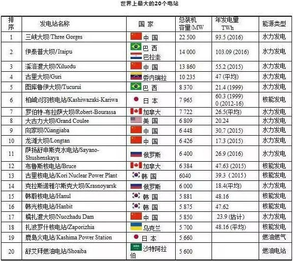 在世界上前20位發(fā)電站中,中國水力發(fā)電占有5席,均為水力發(fā)電。世界上最大的20座發(fā)電站每年都有變動,加拿大羅伯特-布拉薩大壩從原有的第17位沖到第7位;韓國古里核電站發(fā)展壓水反應(yīng)堆也沖入第13位,超過本國的韓蔚核電站和韓光核電站。