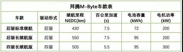 據(jù)官方透露,拜騰M-Byte開始的時候會提供3個版本供消費者選擇,分別是“后驅(qū)標(biāo)準(zhǔn)電池版”、“后驅(qū)長續(xù)航版”、“四驅(qū)長續(xù)航版”。
