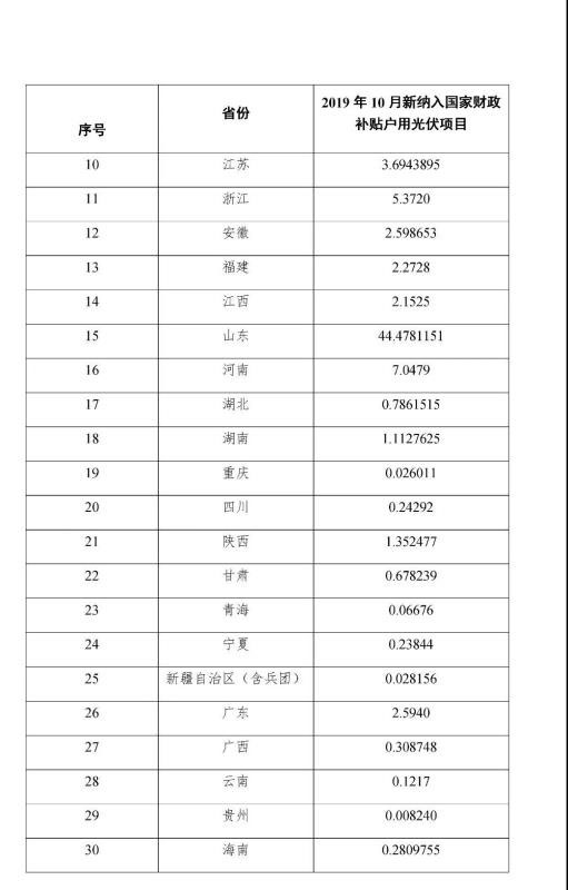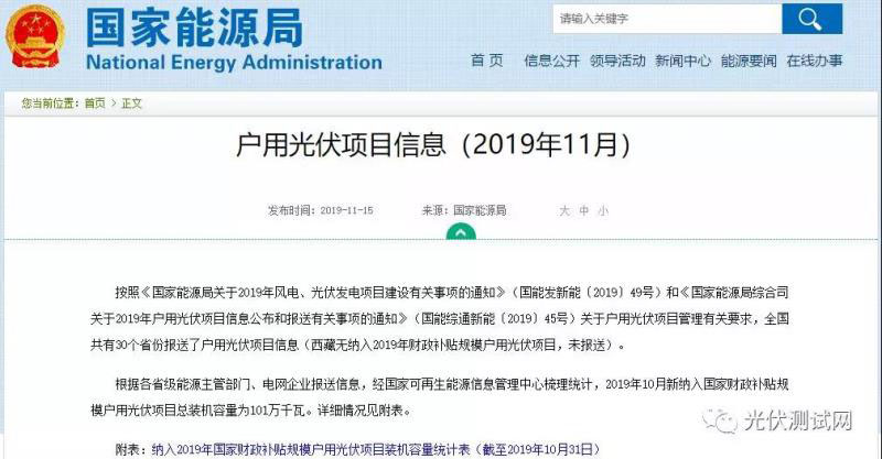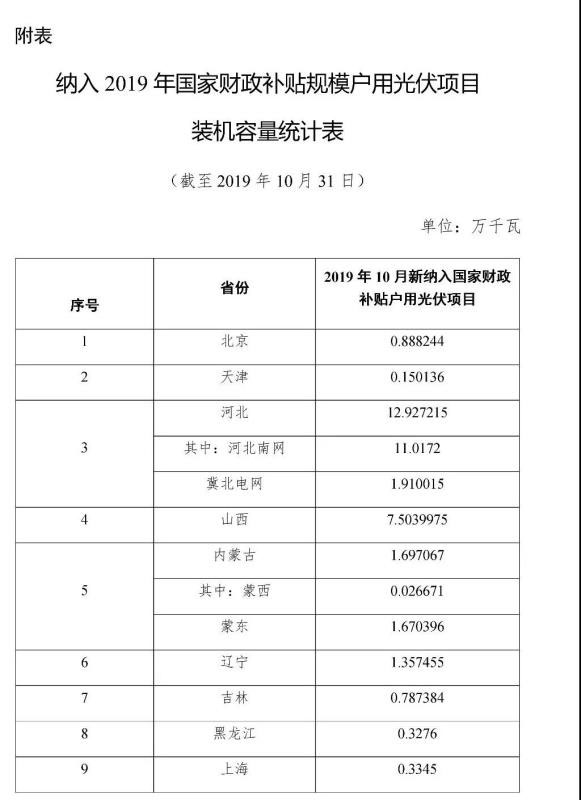 昨日,國家能源局發(fā)布《戶用光伏項(xiàng)目信息(2019年11月)》,統(tǒng)計(jì)了截至10月31日納入2019年國家財(cái)政補(bǔ)貼規(guī)模戶用光伏項(xiàng)目裝機(jī)容量,經(jīng)國家可再生能源信息管理中心梳理統(tǒng)計(jì),2019年10月新納入國家財(cái)政補(bǔ)貼規(guī)模戶用光伏項(xiàng)目總裝機(jī)容量為101萬千瓦。截至10月底,全國戶用光伏裝機(jī)容量共5.3GW納入2019年補(bǔ)貼指標(biāo)。