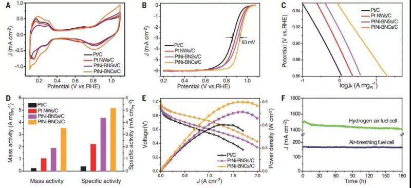 催化劑的半電池性能和氫-氧燃料電池性能圖