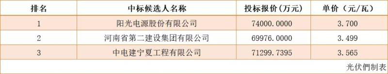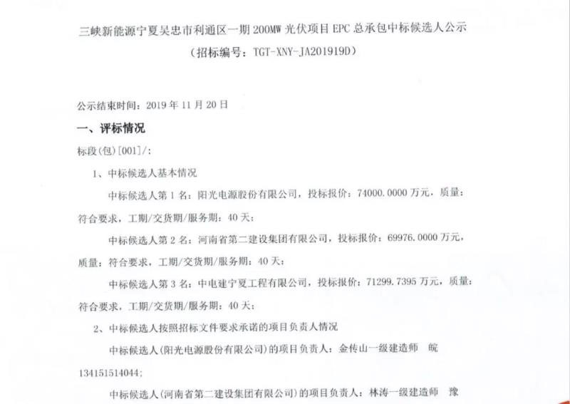 2019年11月18日,三峽新能源寧夏吳忠市利通區(qū)一期200MW光伏項(xiàng)目EPC總承包中標(biāo)候選人公示。其中,陽光電源股份有限公司以總價(jià)74000萬元,單價(jià)3.7元/瓦位列第一中標(biāo)候選人。值得一提的是,該價(jià)格為三名中標(biāo)候選人報(bào)價(jià)中的最高價(jià)。具體信息如下: