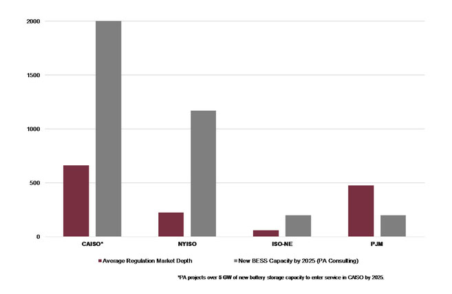 根據(jù)多年來的運營,特別是在電池儲能系統(tǒng)部署增長的情況下,越來越多的電網(wǎng)將面臨風(fēng)力發(fā)電和太陽能發(fā)電的間歇性可再生能源的挑戰(zhàn),并且如果取代靈活的燃氣發(fā)電設(shè)施,將需要大量的響應(yīng)能力以輔助服務(wù)的形式保持穩(wěn)定。不幸的是,對于具有這種觀點的支持者來說,在加州獨立系統(tǒng)運營商(CAISO)和德州電力可靠性委員會(ERCOT)等可再生能源普及率很高的市場中,對滿足輔助服務(wù)能力的需求并未持續(xù)實現(xiàn)。例如,可能包括專門為電池儲能系統(tǒng)設(shè)計的監(jiān)管服務(wù)(例如德州電力可靠性委員會的快速響應(yīng)監(jiān)管服務(wù)或PJM的Reg-D)。即使這樣,這些市場目前也沒有、將來也不太可能提供足夠的需求來容納更多的電池儲能系統(tǒng)容量。