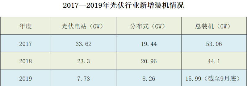 統(tǒng)計數(shù)據(jù)表明,截至2019年三季度,光伏新增裝機規(guī)模僅有16GW,業(yè)內專家對于2019年全年光伏新增裝機總量的預測是不會超過30GW,同比下降了40%。