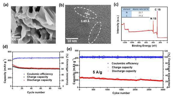 高氮摻雜微晶碳的結(jié)構(gòu)及儲(chǔ)鉀性能:(a)SEM形貌表征(b)TEM顯微結(jié)構(gòu)(c)XPS成分分析(d)低電流密度下的電池容量(e)5 A/g大電流下的長(zhǎng)循環(huán)性能