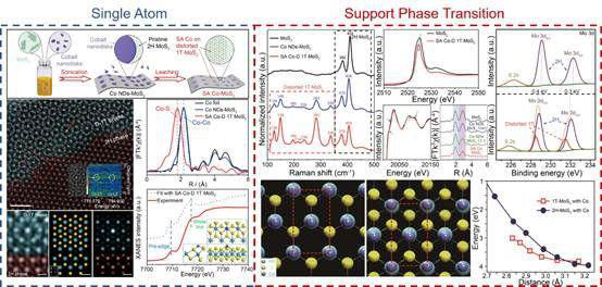 該工作報(bào)導(dǎo)了一種新型單原子催化劑制備策略(assembly/leaching):先把鈷(Co)納米盤組裝到二維二硫化鉬(MoS2)上再浸出,獲得了在扭曲金屬相(1T)二硫化鉬上高負(fù)載量金屬鈷單原子陣列 (SA Co-D 1T MoS2)。在Co ND-MoS2納米復(fù)合材料中,晶格失配導(dǎo)致的應(yīng)變和在Co與MoS2間形成Co-S共價(jià)鍵是實(shí)現(xiàn)MoS2從半導(dǎo)體2H相向畸變的金屬1T(D-1T)相轉(zhuǎn)變的關(guān)鍵。