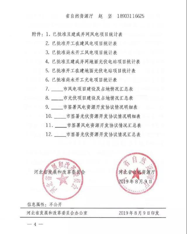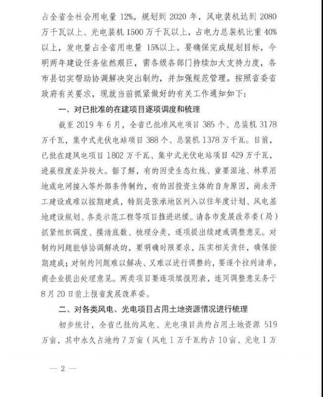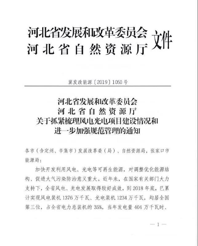 1、請對8月上旬印發(fā)《關(guān)于抓緊梳理風(fēng)電光電項目建設(shè)情況和進(jìn)一步加強規(guī)范管理的通知》(冀發(fā)改能源(2019)1050號)后,各市已上報的各類風(fēng)電光電項目開發(fā)協(xié)議抓緊補充、完善,未上報的補充上報。