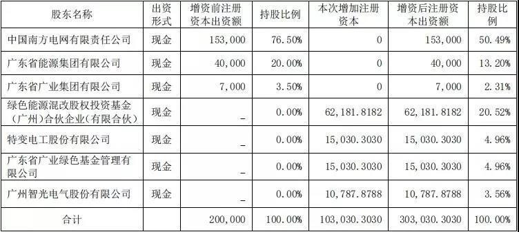 2019年6月28日,該項(xiàng)目掛牌期滿,共征集到6家符合條件的意向投資方,隨后經(jīng)過三天兩輪緊張的競爭性談判,最終確定4家投資方入圍,分別為:綠色能源混改股權(quán)投資基金(廣州)合伙企業(yè)(有限合伙)投資9.2億元,占股20.52%;特變電工投資2.23億元,占股4.96%;廣州智光電氣股份有限公司投資1.6億元,占股3.56%;廣東省廣業(yè)綠色基金管理有限公司投資2.23億元,占股4.96%。