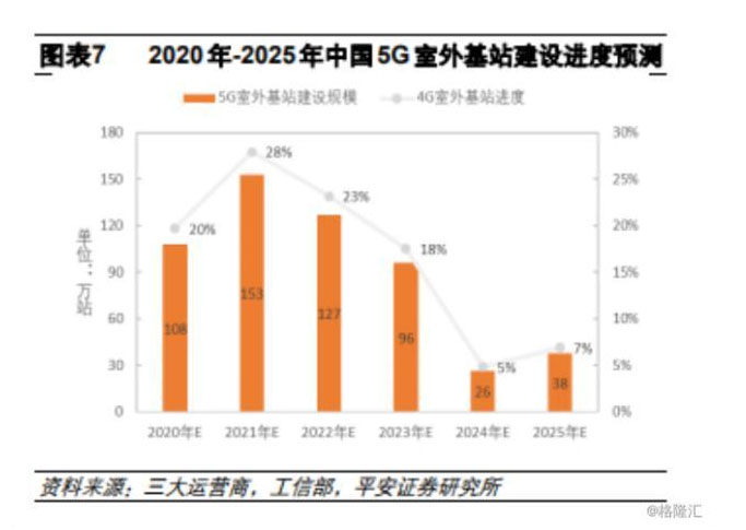 另外,按照5G室外基站覆蓋半徑大約是4G室外基站的一半,5G室外基站數(shù)目至少是現(xiàn)有4G室外基站的2倍來(lái)算,根據(jù)平安證券預(yù)計(jì),中國(guó)電信至少需要200萬(wàn)站5G室外基站,中國(guó)移動(dòng)至少需要360萬(wàn)站5G室外基站,中國(guó)聯(lián)通至少需要180萬(wàn)站 5G 室外基站。
