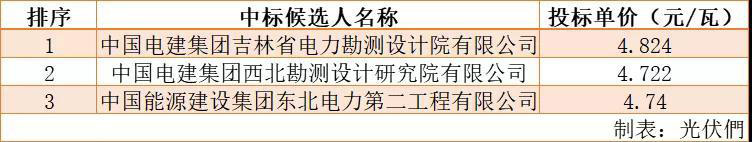 11月26日,中廣核吉林白城光伏(100MW)領(lǐng)跑激勵(lì)1號(hào)項(xiàng)目設(shè)計(jì)施工總承包工程公示中標(biāo)候選人。根據(jù)公示內(nèi)容,中國電建集團(tuán)吉林省電力勘測(cè)設(shè)計(jì)院有限公司以單價(jià)4.824元/瓦位列第一中標(biāo)候選人,詳情如下: