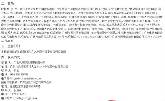 比托西(廣州)礦業(yè)有限公司用戶側(cè)儲(chǔ)能項(xiàng)目EPC總承包中標(biāo)候選人的公示