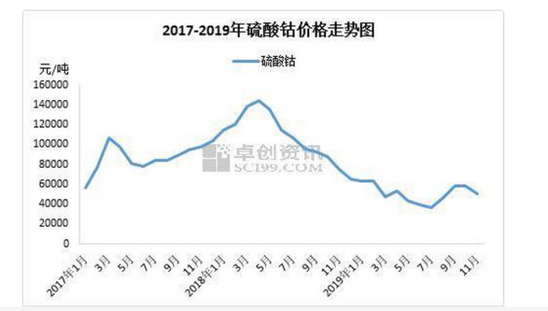 10月份三元正極材料廠商開工疲軟,出貨情況不佳,部分企業(yè)簽單出貨出現(xiàn)較大幅度下降。正極材料市場增量難尋,并且動力電池需求持續(xù)疲軟,同比情況均為下降。鈷及其化合物市場價格持穩(wěn)后進入下行通道。硫酸鈷市場主流成交跌至55000元/噸附近,需求端萎靡極大影響了采購信心,實際采購價格集中于55000-59000元/噸。
