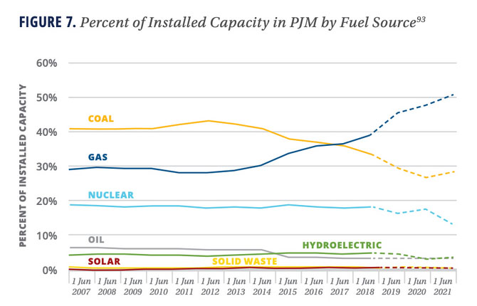 盡管太陽能和儲能現(xiàn)在的成本與新的天然氣發(fā)電相比具有競爭力,但美國過剩化石能源發(fā)電為天然氣發(fā)電設施的建設與運營提供了巨大的動力。據(jù)彭博社報道,過去兩年,PJM地區(qū)的天然氣發(fā)電量增加了11GW,并且計劃再增加34GW。GridStrategies公司的調(diào)查報告中的圖表說明了這種動態(tài)性。