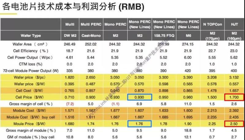 從PV InfoLink列出的電池片技術(shù)成本與利潤(rùn)分析也可看出,異質(zhì)結(jié)電池目前較PERC而言仍有一定差距,亟待成本繼續(xù)下降。據(jù)了解目前異質(zhì)結(jié)組件售價(jià)仍在2.5元/瓦左右,而今年下半年以來(lái)單、多晶組件價(jià)格都在快速下降,單晶PERC組件均價(jià)1.77元/瓦、普通多晶組件1.61元/瓦。