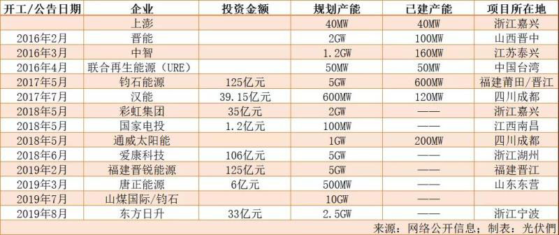 異質(zhì)結(jié)的擴(kuò)產(chǎn)風(fēng)潮自2018年起就已興起,彩虹集團(tuán)、國(guó)家電投、通威太陽(yáng)能、愛(ài)康科技先后宣布進(jìn)軍異質(zhì)結(jié)領(lǐng)域。2019年,山煤國(guó)際宣布將與鈞石能源共建10GW異質(zhì)結(jié)項(xiàng)目,這是目前已公開的規(guī)劃產(chǎn)能最大的異質(zhì)結(jié)擴(kuò)產(chǎn)計(jì)劃。