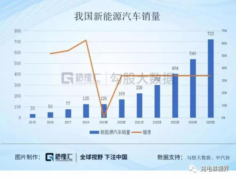 今年我國(guó)汽車銷量預(yù)計(jì)達(dá)到2569萬(wàn)輛,假設(shè)汽車行業(yè)2020-2025年復(fù)合增速為2%,銷量達(dá)到2893萬(wàn)輛,新能源汽車銷量預(yù)計(jì)是126萬(wàn)輛。2025年新能源汽車滲透率為25%,對(duì)應(yīng)國(guó)內(nèi)新能源汽車銷量為723萬(wàn)輛,則2019-2025年復(fù)合增速達(dá)34%。34%相比2018年之前的增速要低很多,今年由于補(bǔ)貼退坡因素增長(zhǎng)乏力,未來(lái)補(bǔ)貼退坡減弱,這個(gè)增速是比較合理的。